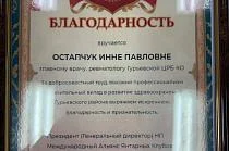 Сегодня Игорь Юрьевич Макеев, президент (генеральный директор) НП «Международный Альянс Янтарных клубов», вручил от имени организации благодарность главному врачу Гурьевской центральной районной больницы Инне Павловне Остапчук за добросовестный труд, высокий профессионализм и значительный вклад в развитие здравоохранения Гурьевского района.